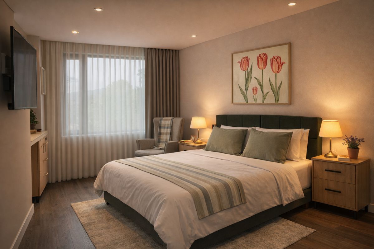 Inspirados en usted, hemos diseñado un edificio moderno y acogedor, con amplias zonas sociales iluminadas por luz natural, vistas excepcionales y cómodas habitaciones. Cada detalle ha sido pensado para garantizar el cuidado integral y el confort que han distinguido a Calucé durante más de 50 años.